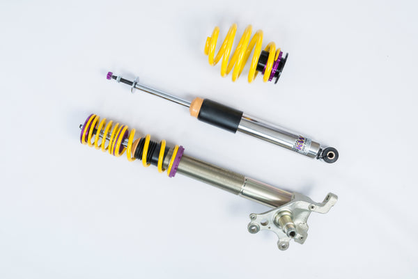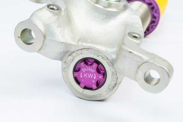 Cutting-edge motorsports technology for more performance on the road. Like every suspension product developed by KW automotive, the suspension manufacturer, and manufactured in Germany, the KW V3 Coilover suspension kit also provides a significant plus in safety reserves in road traffic. Thanks to the chassis with its high-quality dampers, springs, and elastomer spring elements, pitching and rolling movements during load changes such as evasive maneuvers, cornering, acceleration, and braking are significantly reduced. The braking distances are also shortened. Thanks to improved support and feedback, drivers not only feel safer but driving in everyday life becomes even safer. With compression and rebound stage damping, that can be set separately and independently of each other, the damper setup can be customized to your personal driving preferences or vehicle changes such as weight, tire characteristics, or altered vehicle rigidity. True performance optimization is only possible with this unique, patented system. For example, this allows the compression damping force to be increased and get more grip from the tires, to improve cornering behavior and reduce squat without simultaneously altering the rebound stage damping which is optimally matched to the spring rate, a scenario which results in reduced grip and the associated loss of performance. The KW V3 coilover kit is the ideal tool for performance-oriented drivers and experienced tuning enthusiasts who place a strong emphasis on the overall performance of their suspension. The Variant 3 features patented TVR-A and TVC-A technology that provides separately adjustable rebound and compression damping. The extensive adjustment range of the independently configurable rebound and compression make it easy to directly influence the steering behavior, directional stability, grip and handling characteristics for confident and repeatable results at the limit of driving dynamics.This Part Fits: