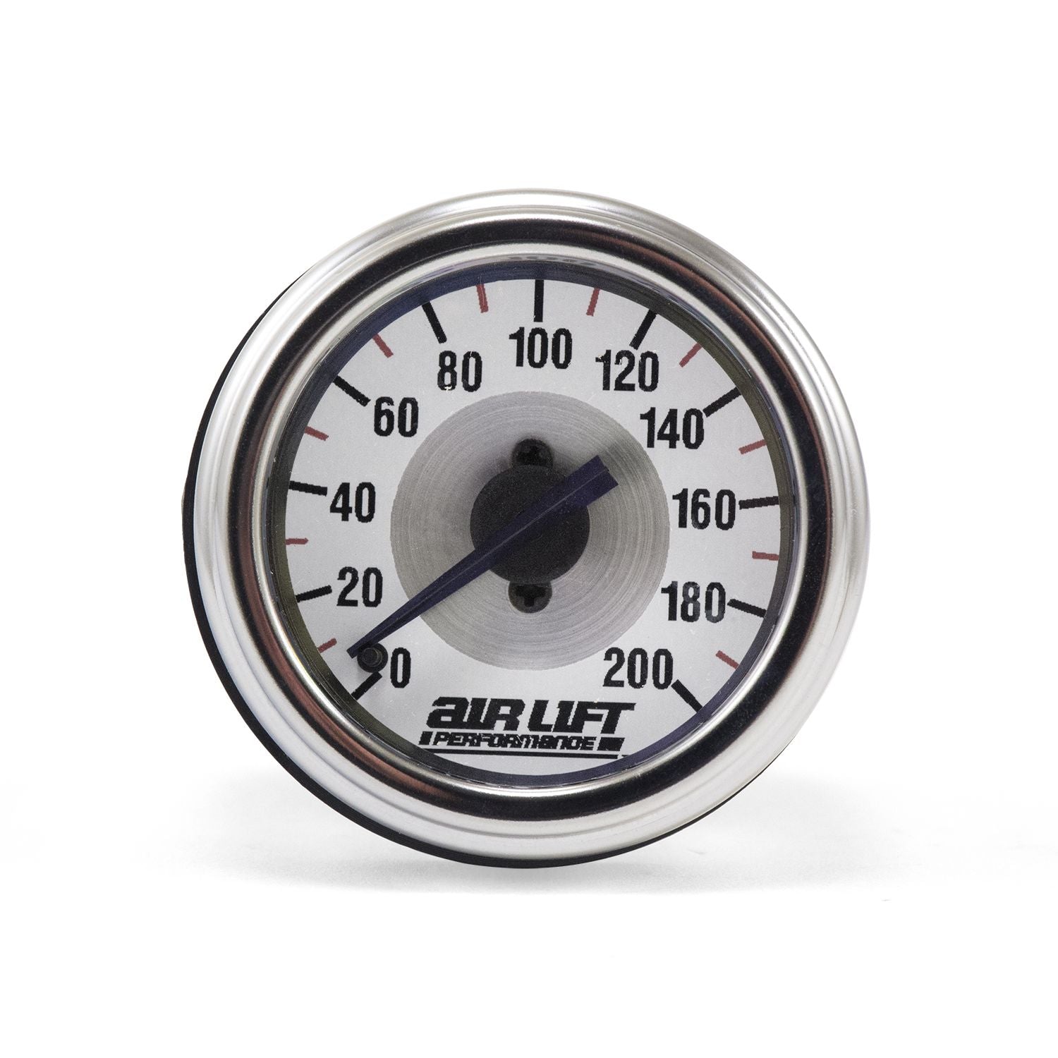 Air Lift Performance single needle white face gauge has a spun aluminum center and will read pressures up to 200 PSI. It has a chrome bezel and is also illuminated. Dimensions: 2in diameter by 2 3/4in in depth.- Single Needle Air Gauge